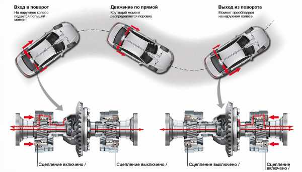 Суть его такова – если при прохождении поворота на наружном колесе сделать скорость вращения больше, чем это обеспечивает дифференциал, то возникает эффект подруливания. За счет этого колесо, идущее по внешнему радиусу, «доворачивает» авто, позволяя ему лучше войти в поворот.