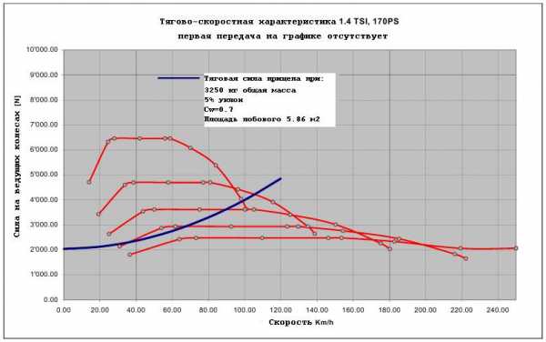 За основу взят 5% уклон, коэффициент лобового сопротивления 0.7, площадь лобового сопротивления 5.87 м2 и общая масса 3250 кг. 1-я передача для лучшего рассмотрения исключена.