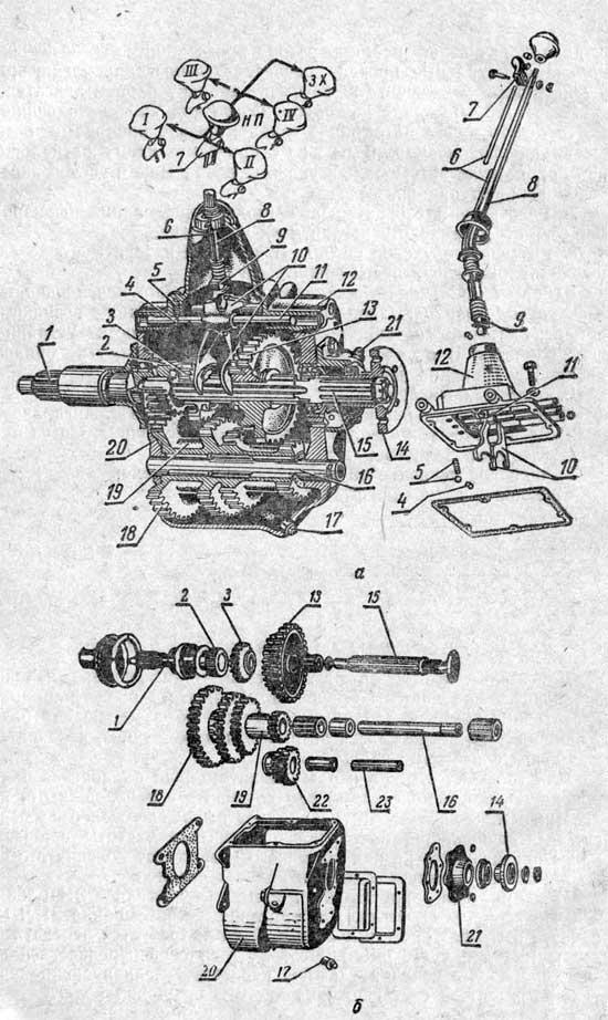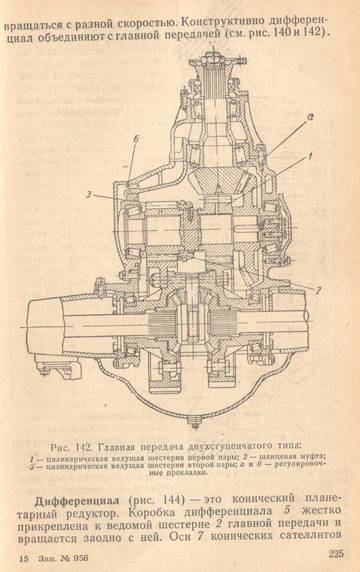 Ведущая цилиндрическая шестерня 5 также выполнена как одно целое с валом, установленным на конических роликоподшипниках 3 и 16. На этот вал напрессована и прикреплена к его фланцу заклепками ведомая коническая шестерня 14. Ведомая цилиндрическая шестерня 22 расположена между фланцами чашек 19 дифференциала и прикреплена к ним болтами. Коробка дифференциала с коническими шестернями 20 полуосей и сателлитами 17 установлена на двух конических роликоподшипниках 23.