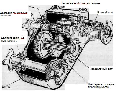 Двойная главная передача при сравнительно небольших размерах шестерен позволяет получить значительное передаточное число.