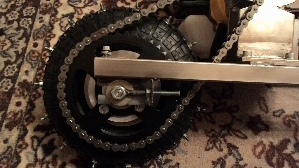 По затратам времени вторая после снегокатов и саней по привлекательности конструкция самодельный снегоход из бензопилы на широких надувных камерах от колес грузовика или трактора. На их поверхность для прочности наносится равномерный слой жидкой резины или наклеивается другой гибкий и непромокаемый материал. По окружности на равном расстоянии друг от друга поперек камеры надеваются цепи или прочно крепятся поперечины для увеличения сцепления. Диски для колес можно взять велосипедные, мотоциклетные или сделать самостоятельно.