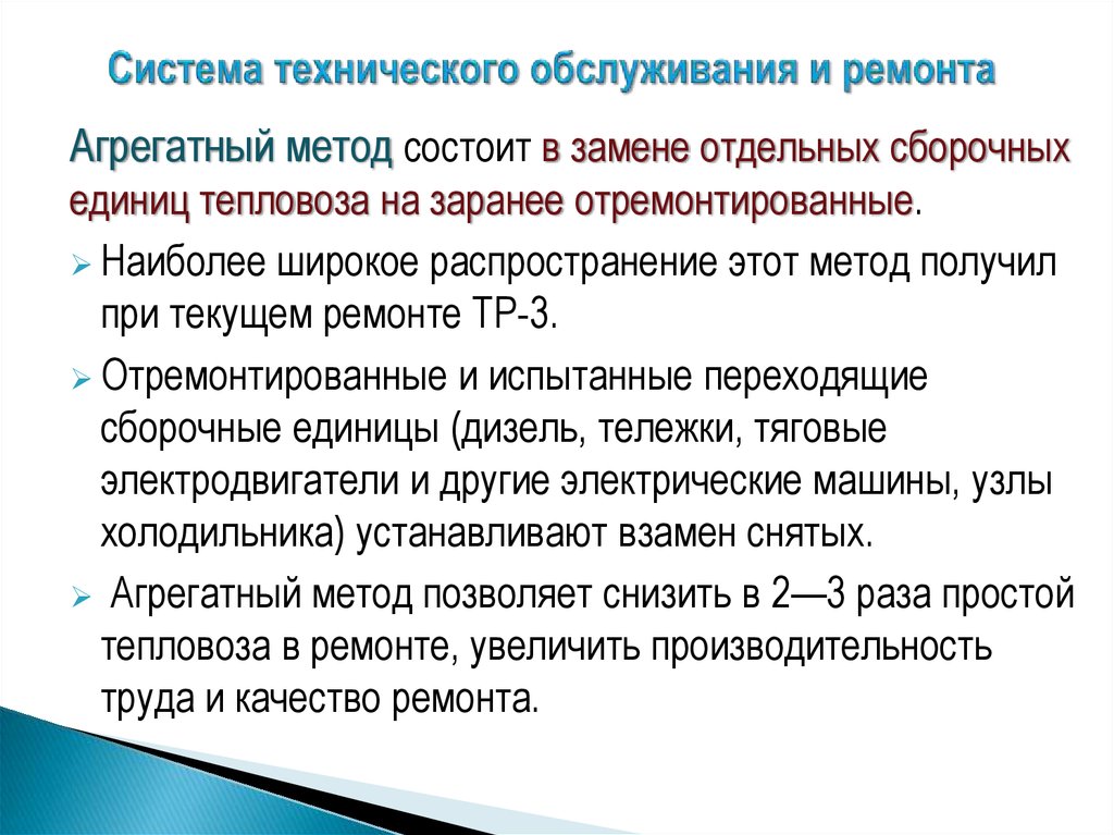 Агрегатный метод ремонта — это обезличенный метод, при котором неисправные сборочные единицы, узлы и агрегаты заменяются новыми или заранее отремонтированными. [8]