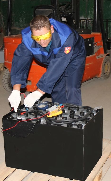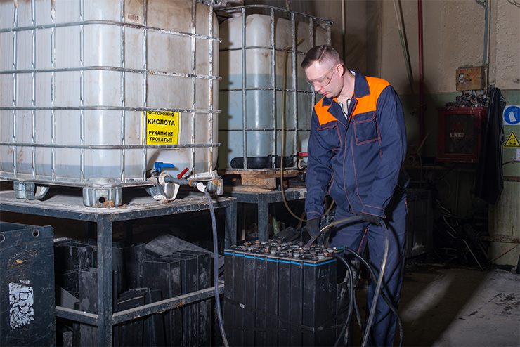 Пол рабочего помещения ( аккумуляторного цеха), где выполняют ремонт аккумуляторов, должен быть кирпичный или бетонный, нескользкий и без выбоин.