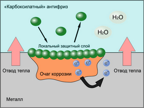 Карбоксилатные присадки точечно покрывают защитным слоем только очаги коррозии, а остальные металлические поверхности эффективно отдают тепло. Как следствие: снижается тепловая нагрузка на двигатель. Кроме того, органические присадки не образуют осадка.