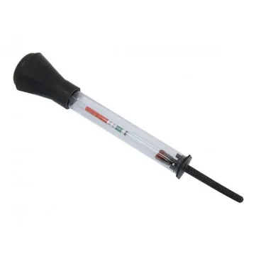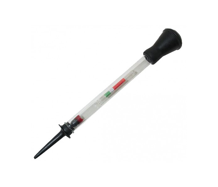 Ареометр для свинцово-кислотных аккумуляторов представляет собой специальный тип ареометра, который выглядит как шприц с грушей. Внутри колбы находится поплавок, калиброванный для измерения удельного веса (SG). Чтобы использовать ареометр, нужно высосать немного электролита из аккумулятора (H 2 SO 4 ) из батареи в колбу и считайте значение, указанное плавающим в образце поплавком.