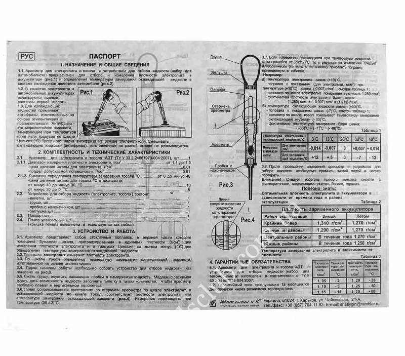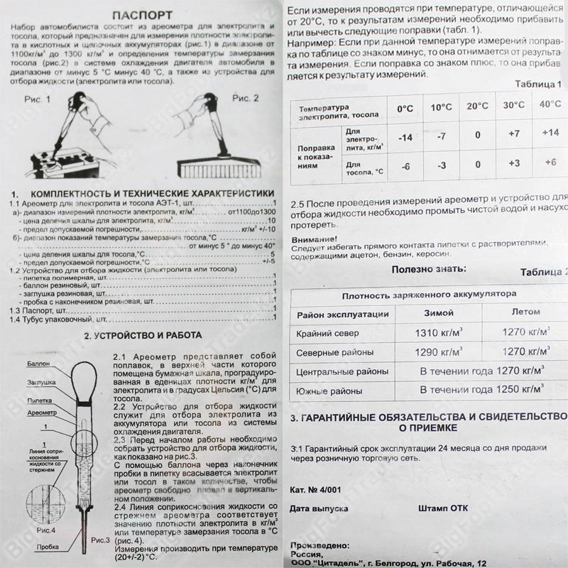 Ареометр электролита и тосола АЭТ-1, инструкция по эксплуатации