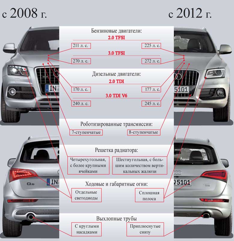 Доработку модели не зря поручили асу немецкого дизайна Маттиасу Финку: новый облик кроссовера самобытен и свеж, но в то же время неуловимо сходен с флагманским Q8. Общее впечатление формируют сухие линии граненого корпуса, точные контуры восьмиугольной радиаторной решетки с вертикальными ламелями, угловатый бампер с интегрированными воздухозаборниками и многоярусные блоки передней и задней оптики, визуально объединенные отштамповкой поясной линии кузова.
