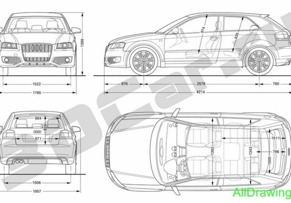 На графиках представлены габариты автомобиля Audi Q3 I – ширина, длина и высота.