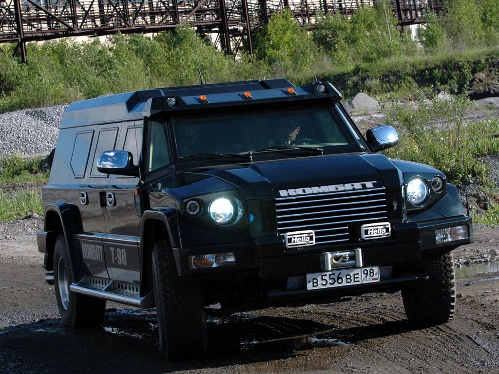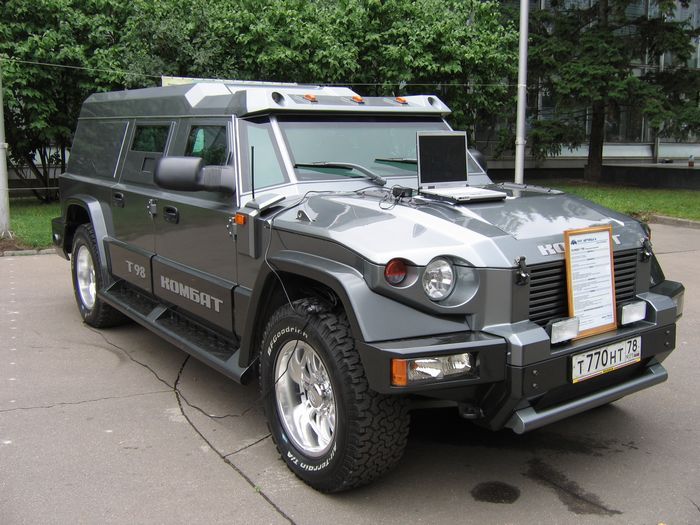 «Комбат»-внедорожник размера XXL, созданный в КБ Дмитрия Парфенова. Издалека может показаться, что «наша» большая машина-лишь пародия на «их» большой Hummer. Но, несмотря на то, что форма внедорожника действительно напоминает рубленое железо первого «Хаммера», их содержание несопоставимо. Если первый «молоток» представляет собой демилитаризованный вариант армейского транспортера, «Комбат» создавался как VIP-броневик для передвижения в опасной местности.