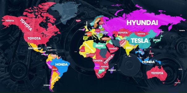 Если посмотреть на карту в целом, то сразу в глаза бросается мировая популярность марки Тойота.