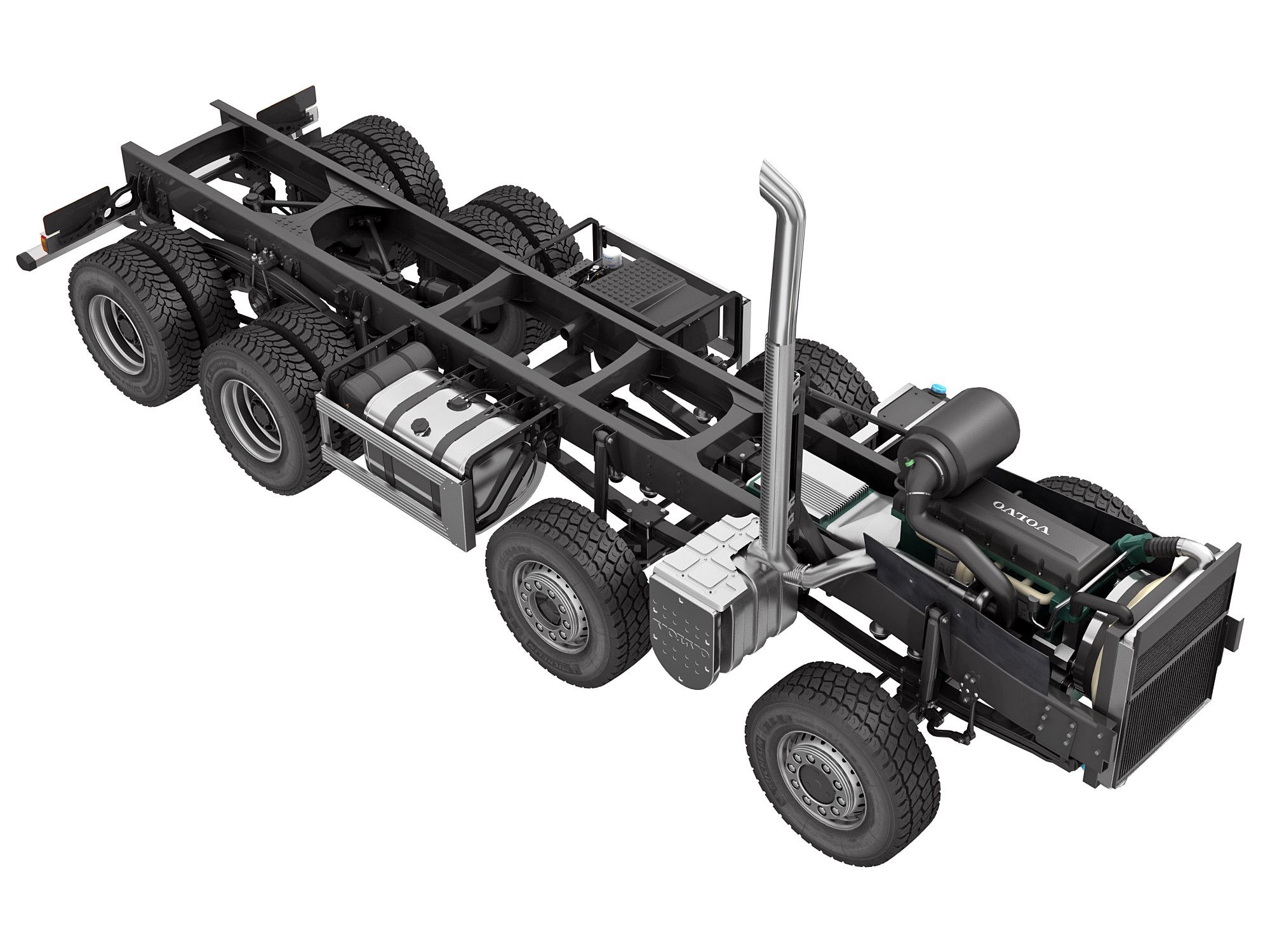 Рама также служит для размещения широкого спектра навесных деталей — топливных баков, держателей аккумуляторных батарей, воздушных баллонов, системы выпуска ОГ, запасного колеса.