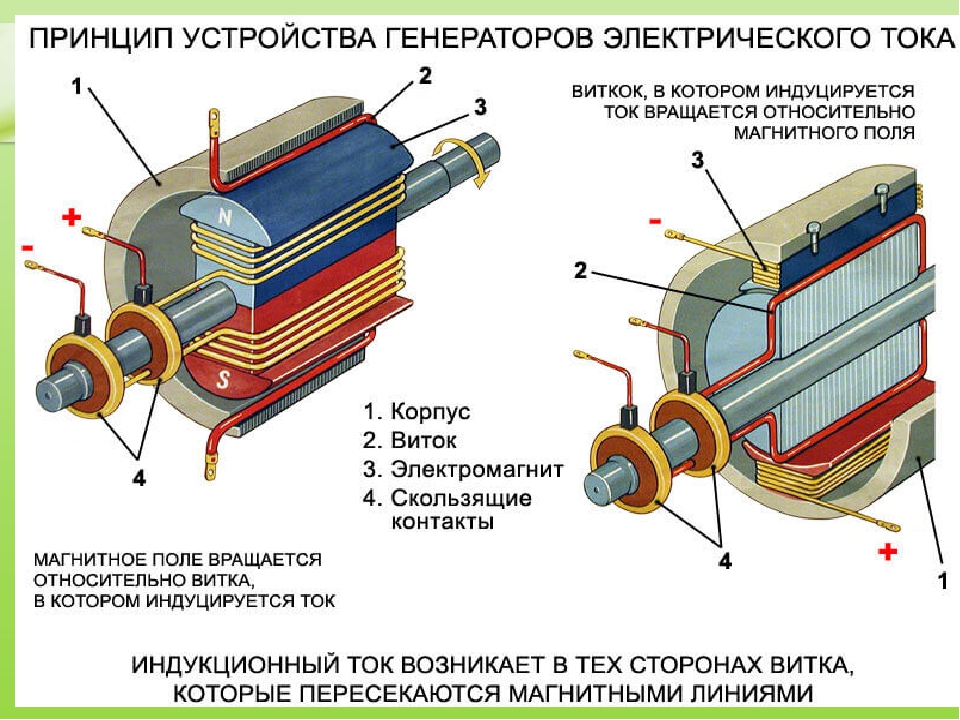 В основе работы генератора лежит эффект электромагнитной индукции. Если катушку, например, из медного провода, пронизывает магнитный поток, то при его изменении на выводах катушки появляется переменное электрическое напряжение.
