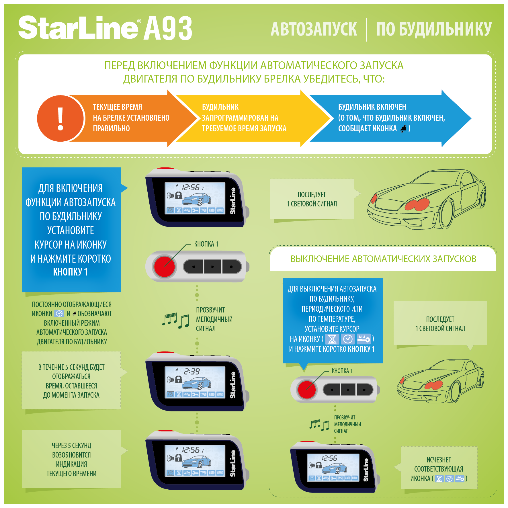 Такая сигнализация с обратной связью и автоматическим запуском дает возможность установить запуск машины по будильнику телефона в определенные дни, автоматический пуск без напоминания, запуск в зависимости от температуры и запуск с помощью звонка или смс сообщения автомобилю.
