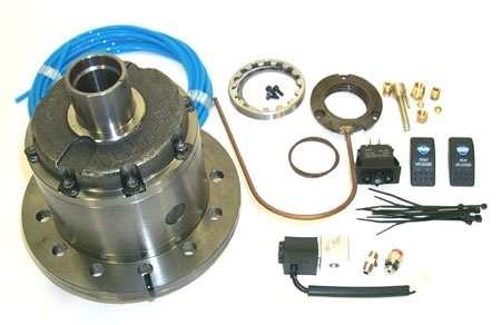 Дифференциал 9,5 Semi Float. Диаметр полуоси 33 (1.31). Количество шлицов на полуоси — 30. Передаточное число ГП — 3.70-5.29. Кол-во болтов ГП: 12. Комплект блокировки включает: дифференциал с блокировкой, паневмо-соленоид ресивера компрессора, актуатор блокировки с уплотнениями, кнопка -переключатель, фитинги для врезки в редуктор моста, воздушная магистраль.