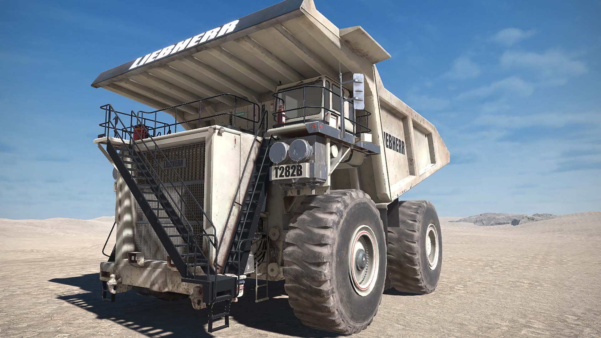 Liebherr T282B – это самый большой грузовик в мире, габаритами 4,5х9х 7,4 м и весом 592 т и способный развивать скорость 64 км/ч и за раз перевозить щебень весом до 363 т. Машина с диаметром шин 55/80R63 оборудована 20-циллиндровым двигателем Detroit Diesel, объёмом 90 л, мощностью 3650 л. с. Большой грузовик должен иметь хорошие тормоза, чтобы не создавать приключений на дорогах, а потому инженеры-конструкторы оснастили модель двухдисковыми передними и задними дисковыми тормозами, а также ручником с максимальным наклоном 15%.