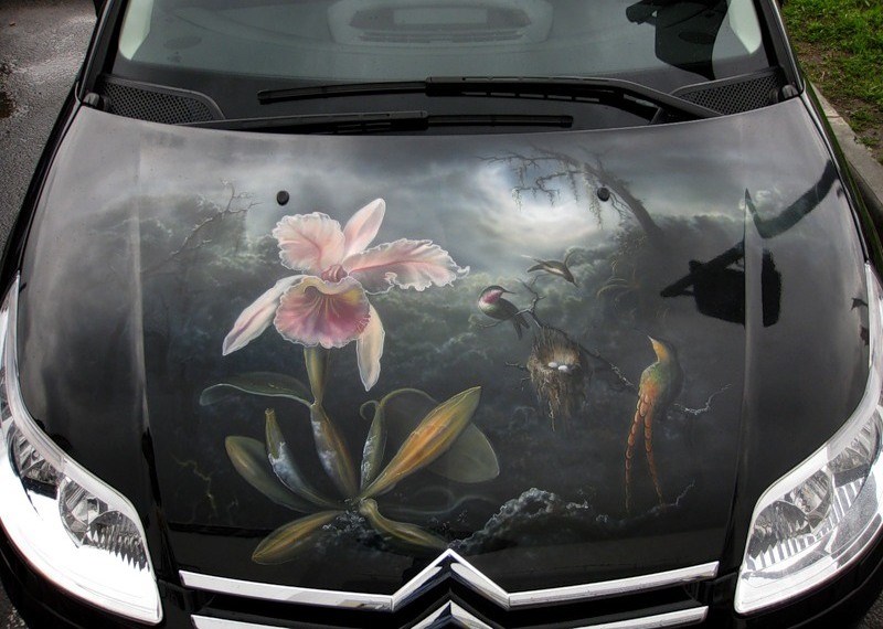 Если рисовать автомобильной краской, то нужно использовать базовые краски (которые при покраске автомобиля должны покрываться лаком), без отвердителя. Красками, разведёнными отвердителем нормально рисовать не получится.