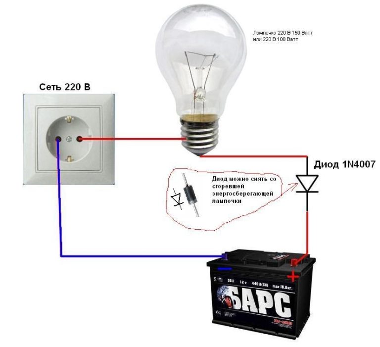 Итак, берем 220 В, в разрыв плюса последовательно подключаем лампу 220 В 100−150 Вт. Не спрашивайте зачем, просто так надо. Затем случайно в багажнике находим диодный мост, рассчитанный на ток не менее 10А для преобразования переменного тока в постоянный и подключаем его. Всё. Схема собрана. Одеваем защитную каску, бронежилет и втыкаемся в сеть. Должно сработать.