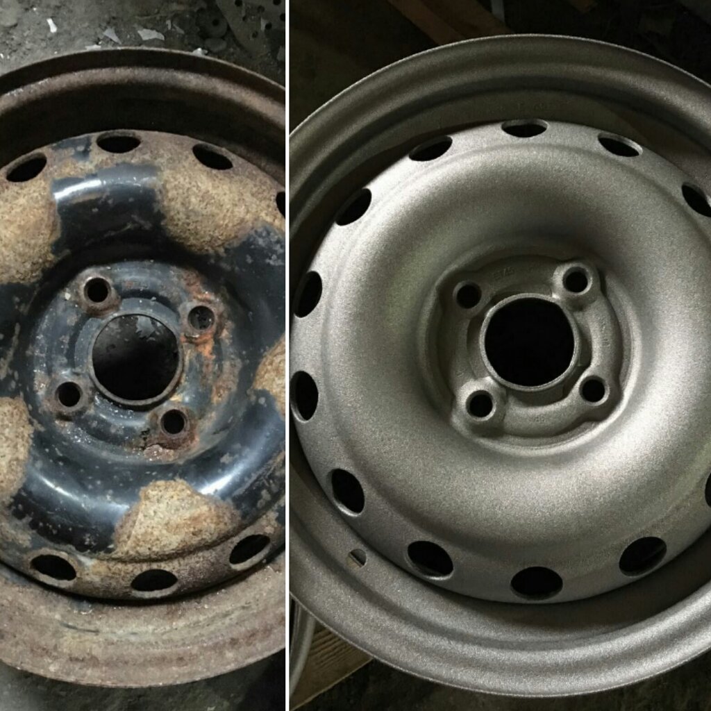 Можно конечно зачистить диски самостоятельно с помощью шлиф-машинки, но придётся затратить на удаление старой краски и ржавчины (окиси алюминия) больше времени, так как основная трудность состоит в снятии краски в ямках, впадинах обода (там где болты, выштампованный или отлитый рисунок и т.п.).