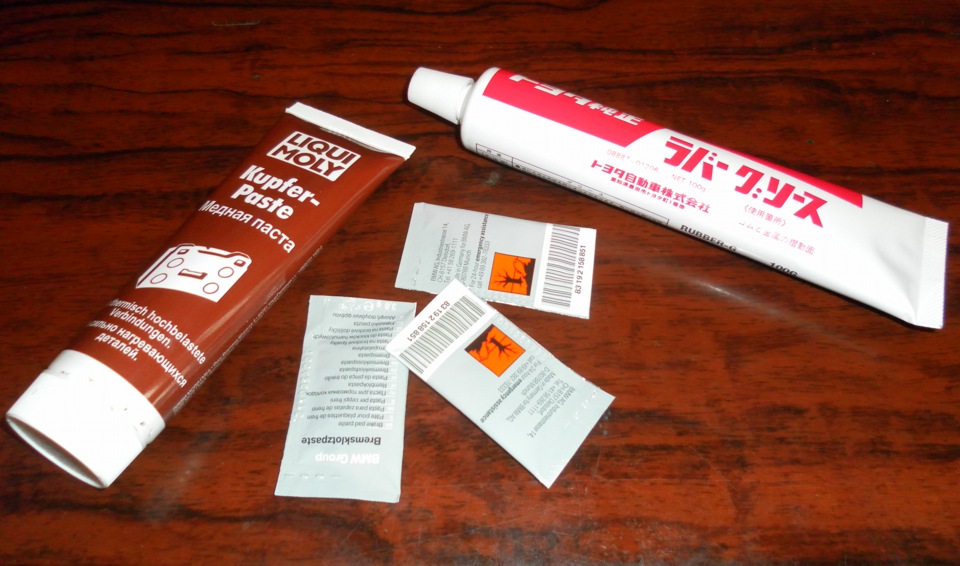 В ремкомплекте, которым обеспечивают производители автосервисы своего модельного ряда авто, часто присутствует либо одна упаковка универсальной смазки, либо отдельные стикеры противоскрипной смазки и пакетик для направляющих суппортов.