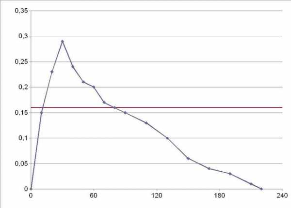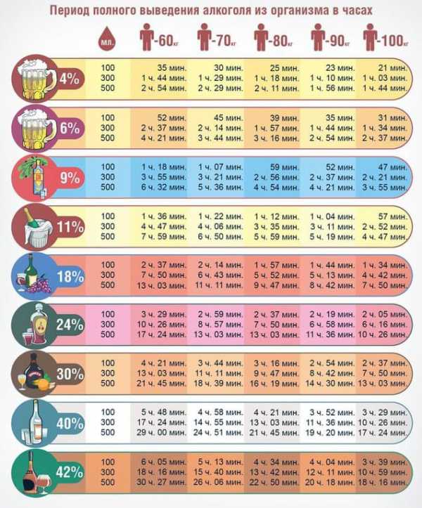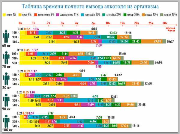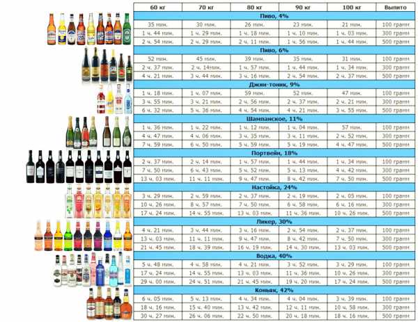 | Водка 40% | 100 | 6 часов | 5 часов 30 мин. | 4 часа 25 мин. | 3 часа 45 мин. |