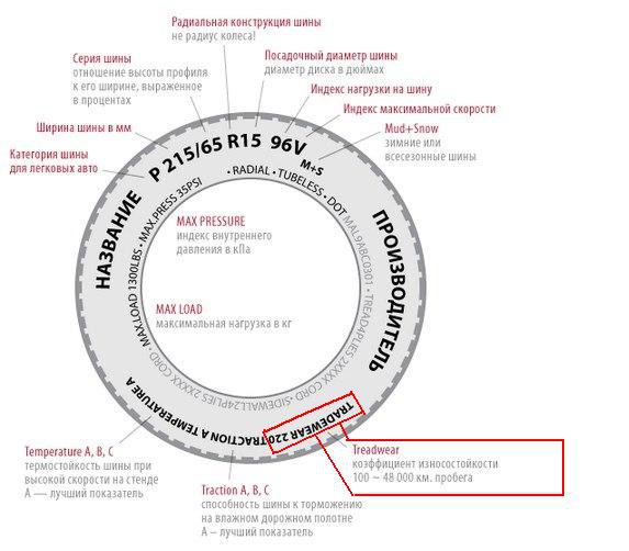 Treadwear – надпись указывает на относительный километраж пробега покрышки.