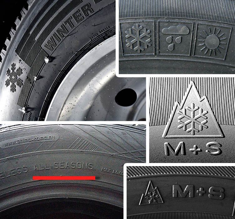 Как узнать сезонность покрышкиСамый надёжный вариант — свериться с каталогом производителя шины. Но можно и просто внимательно поискать на её боковине соответствующий значок или надпись. Маркировка зимних шин регламентирована и представляет собой снежинку на фоне трёх горных пиков. Летние покрышки не имеют единой маркировки. На них могут быть отформованы цветы, капли дождя и т.п. Нередко встречаются обозначения M+S, R+W или All Season. Так производители маркируют условно всесезонные шины.