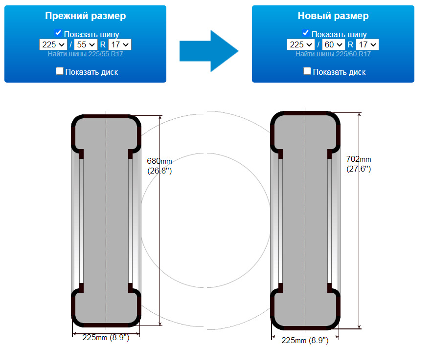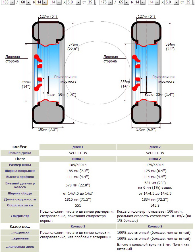 ΠΠΈΠΆΠ΅ ΠΏΡΠΈΠ²Π΅Π΄Π΅Π½ ΠΏΡΠΈΠΌΠ΅Ρ Π·Π°ΠΌΠ΅Π½Ρ ΡΡΠ°ΡΠ½ΡΡ ΡΠΈΠ½ β195/60 R15β Π½Π° β185/65 R15β. ΠΠ· ΡΠ°Π±Π»ΠΈΡΡ Π²ΠΈΠ΄Π½ΠΎ, ΡΡΠΎ ΠΏΡΠΈ ΡΠ°ΠΊΠΎΠΉ Π·Π°ΠΌΠ΅Π½Π΅ ΡΠΈΡΠΈΠ½Π° ΡΠΌΠ΅Π½ΡΡΠΈΡΡΡ Π½Π° 10 ΠΌΠΌ, Π° Π²ΡΡΠΎΡΠ° ΠΏΡΠΎΡΠΈΠ»Ρ ΡΠ²Π΅Π»ΠΈΡΠΈΡΡΡ Π½Π° 3 ΠΌΠΌ. Π’Π°ΠΊΠΈΠ΅ ΠΌΠΈΠ½ΠΈΠΌΠ°Π»ΡΠ½ΡΠ΅ ΠΈΠ·ΠΌΠ΅Π½Π΅Π½ΠΈΡ Π²ΡΡΠ΄ Π»ΠΈ ΠΊΡΠΎ-ΡΠΎ ΠΏΠΎΡΡΠ²ΡΡΠ²ΡΠ΅Ρ ΠΏΠΎ ΠΏΠΎΠ²Π΅Π΄Π΅Π½ΠΈΡ Π°Π²ΡΠΎΠΌΠΎΠ±ΠΈΠ»Ρ.Β