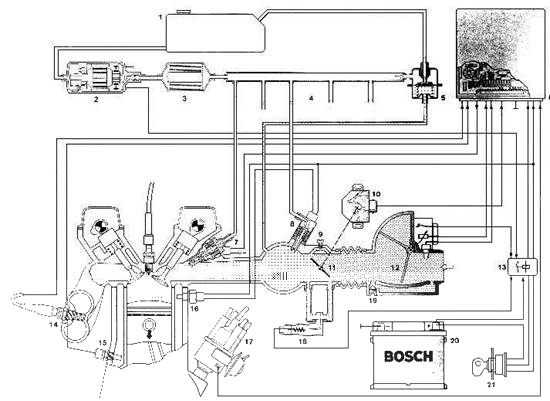 Это означает, что топливо непрерывно впрыскивается во впускной коллектор. Система полностью механическая. С конца 1979 года эта система была модифицирована путем добавления системы лямбда-регулирования (KA-jetronic). Эта система показана на рисунке ниже, компоненты 11, 12, 16 и 18 являются специфическими для этой системы лямбда-регулирования и поэтому отсутствуют в механической системе K-jetronic.