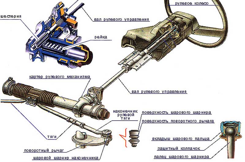 Вроде все просто, вот только количество соединений в рулевом управлении действительно много – карданная передача в колонке, шестерня с рейкой, рейка с тягами и тяги с поворотными кулаками. Все эти соединения – подвижные, поэтому образование люфта в них – дело времени.