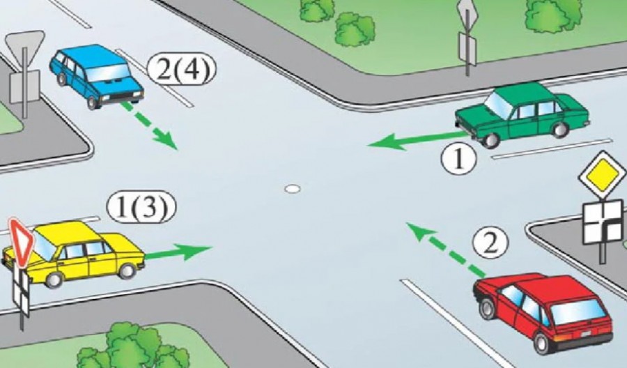 В такой ситуации траектория, по которой двигается ваше транспортное средство, может пересекаться с траекториями других машин. Чтобы избежать столкновения на перекрестке без регулировщика, следует уступать проезд ТС, которые: