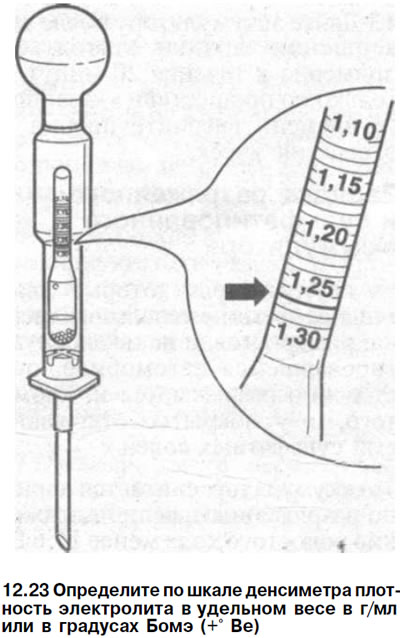 Иными словами, чем удельный вес вещества (жидкости) больше, тем выше ее плотность. Эталоном плотности выбрана дистиллированная вода, плотность которой принята равной 1,000 при температуре 80°Ф (27°С). Плотность чистой серной кислоты составляет 1,835. Нормальная концентрация водного раствора серной кислоты (раствора, состоящего на 64% из воды и на 36% из серной кислоты, называемого электролитом) характеризуется плотностью электролита в пределах от 1,260 до 1,280 при температуре 80°Ф (27°С). Чем выше плотность электролита в аккумуляторной батарее, тем выше степень ее заряженности.