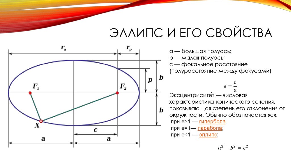 Определение. Форма эллипса определяется характеристикой, которая является отношением фокусного расстояния к большей оси и называется эксцентриситетом