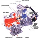 Работа турбокомпрессора основана на принципе увеличения мощности двигателя внутреннего сгорания за счет большого количества воздуха (кислорода) необходимого для воспламенения топлива в камере сгорания.