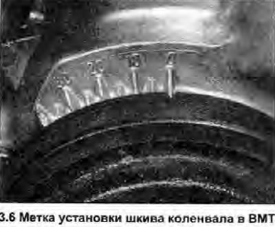 Когда метка на шкиве коленвала совпадет с меткой на задней крышке ремня привода распредвала, а метка на шкиве распредвала совпадет с меткой на корпусе блока цилиндров, поршень находится в ВМТ.