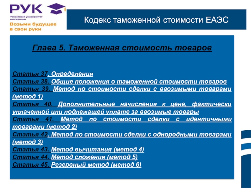 ΡΠΎΠ²Π°ΡΠΎΠ² Π½Π΅Π²ΠΎΠ·ΠΌΠΎΠΆΠ½ΠΎ ΠΏΡΠΈΠΌΠ΅Π½ΠΈΡΡ ΡΡΠ°ΡΡΠΈ 39, 41 — 44 Π½Π°ΡΡΠΎΡΡΠ΅Π³ΠΎ ΠΠΎΠ΄Π΅ΠΊΡΠ°, ΠΎΠΏΡΠ΅Π΄Π΅Π»Π΅Π½ΠΈΠ΅ ΡΠ°ΠΌΠΎΠΆΠ΅Π½Π½ΠΎΠΉ ΡΡΠΎΠΈΠΌΠΎΡΡΠΈ ΡΠΎΠ²Π°ΡΠΎΠ² ΠΎΡΡΡΠ΅ΡΡΠ²Π»ΡΠ΅ΡΡΡ Π² ΡΠΎΠΎΡΠ²Π΅ΡΡΡΠ²ΠΈΠΈ ΡΠΎ ΡΡΠ°ΡΡΠ΅ΠΉ 45 Π½Π°ΡΡΠΎΡΡΠ΅Π³ΠΎ ΠΠΎΠ΄Π΅ΠΊΡΠ°.16. Π ΡΠ»ΡΡΠ°Π΅ Π΅ΡΠ»ΠΈ ΠΏΡΠΈ ΡΠ°ΠΌΠΎΠΆΠ΅Π½Π½ΠΎΠΌ Π΄Π΅ΠΊΠ»Π°ΡΠΈΡΠΎΠ²Π°Π½ΠΈΠΈ ΡΠΎΠ²Π°ΡΠΎΠ² ΡΠΎΡΠ½Π°Ρ Π²Π΅Π»ΠΈΡΠΈΠ½Π° ΠΈΡ