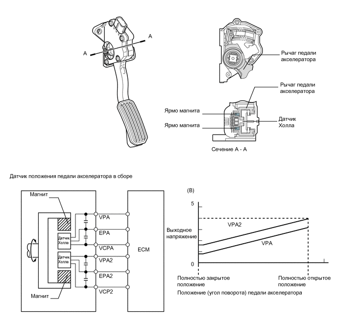 В ЭПА используются два датчика положения педали акселератора (ДППА). ДППА представляют собой резисторы потенциометрического типа, на которые подается питание 5 В от контроллера. ДППА механически связаны с приводом от рычага педали. Две независимые пружины между рычагом педали и корпусом создают возвратное усилие. Получая аналоговый электрический сигнал от ЭПА, контроллер формирует сигнал для управления положением дроссельной заслонки.