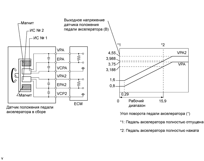 Выходное напряжение ДППА меняется пропорционально нажатию педали акселератора. При отпущенной педали акселератора сигнал ДППА 1 должен быть в пределах 0,50…0,85 В, сигнал ДППА 2 в пределах 0,25…0,43 В. При полностью нажатой педали акселератора сигнал ДППА 1 должен быть в пределах 4,19…4,59 В, сигнал ДППА 2 в пределах 2,095…2,295 В. При любом положении педали акселератора сигнал ДППА 1 должен быть в два раза больше сигнала ДППА 2.