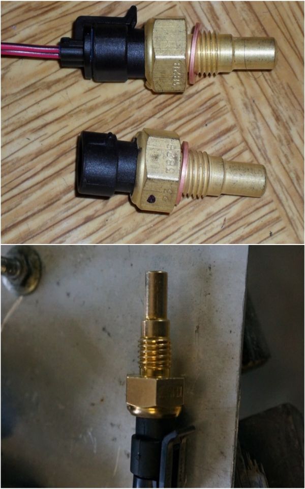Датчик устанавливается между термостатом и головкой блока цилиндров. Это обычный термистор.