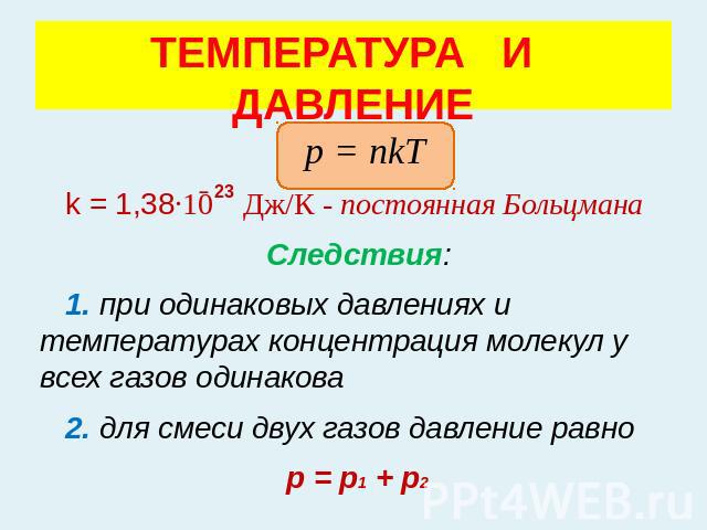 где — давление газа, — концентрация молекул газа (число молекул в единице объема), — постоянная Больцмана, — абсолютная (в шкале Кельвина) температура. Учитывая, что , где — число молекул газа, — объем сосуда, в котором находится газ (часто говорят объем газа), получим из (13.