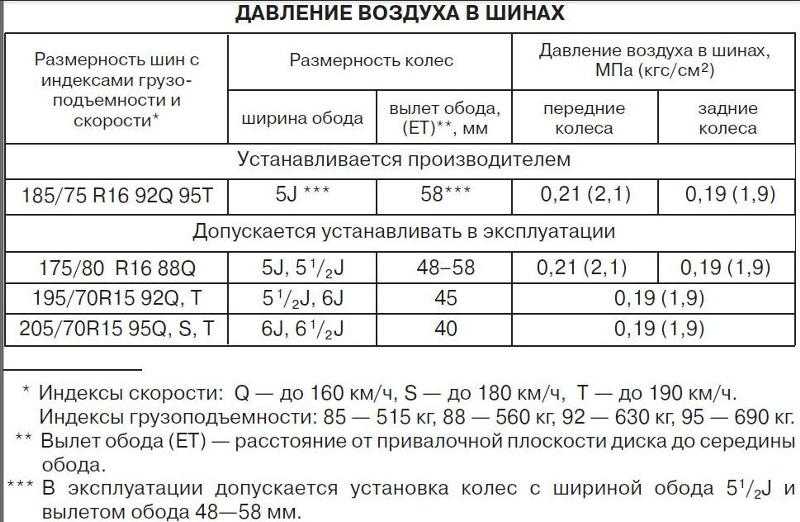- Номинальное давление воздуха в шинах – 2,8 кгс/ см2.