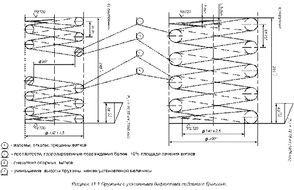 Пружины выбраковывают при изломах, трещинах, следах коррозии более 10 % площади поверхности. Пружины подвергают восстановлению при отсутствии вышеперечисленных дефектов, но получившие усадку по длине и потерявшим свою упругость.