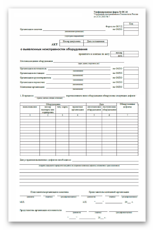 При обнаружении дефектов оборудования в процессе его приемки, монтажа, наладки или испытаниях оформляется акт по форме ОС-16 или заполняется самостоятельно разработанный бланк. При оформлении акта присутствуют представители заказчика и организаций, по вине которых возникли неисправности.
