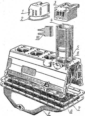1 — крышка клапанов; 2, 5, 8 — прокладки; 3 —головка цилиндра; 4— цилиндр; 6 — шпилька; 7 —картер; 9 — поддон картера; 10 — ребра цилиндра.