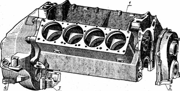 1 — блок-картер; 2 — крышка распределительных шестерен; 3 — крышка коренного подшипника; 4 — картер маховика.