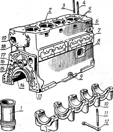 1 — гильза цилиндра; 2 — верхний центрирующий пояс гильзы цилиндра; 3 и 4 — большая и малая шпильки крепления головки цилиндров; 5 — отверстия для штанг толкателей; 6 — резьбовое отверстие для шпильки крепления головки цилиндров; 7 — боковой люк для установки толкателей; 8 — площадка для крепления масляных фильтров; 9 — отверстие для присоединения маслопровода; 10— крышка коренного подшипника; 11 — шпилька крепления коренного подшипника; 12 — замковая шайба; 13 — передняя плоскость для крепления картера шестерен: 14 — опора коленчатого вала; 15 — втулка передней опоры распределительного вала; 16 — фланец для крепления пальца промежуточной шестерни; 17 — главная масляная магистраль: 18 — плоскость для крепления водяного насоса; 19 — окно в водораспределительный канал.