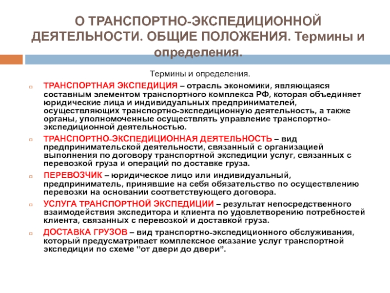 1.3. Организация перевозки основывается на условиях договора перевозки, заключенного между клиентом и экспедитором.