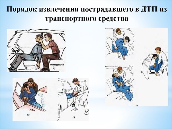 В первую очередь, необходимо помнить, что, смещая потерпевшего, или же извлекая его из автомобиля, мы часто рискуем усугубить полученные им повреждения (сжатие конечностей, переломы, травмы позвоночника), а потому делать это немедленно следует лишь тогда, когда автомобилю грозит взрыв или пожар, или если потерпевшему угрожает наезд каких-либо транспортных средств.