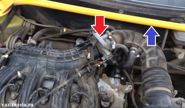 На фото ниже красной стрелкой указано местонахождение узла системы е-газ.