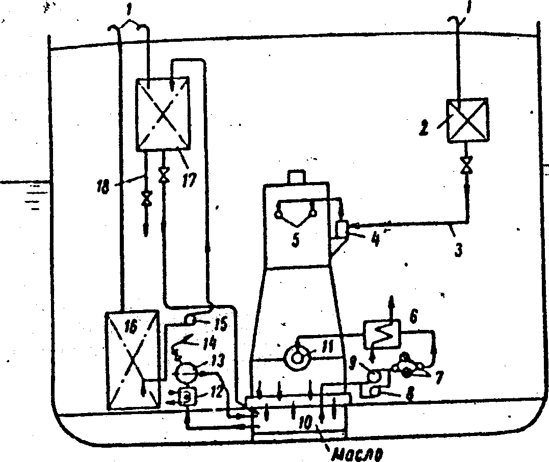 5. Система охлаждения двигателя у вспомогательных дизельгенераторов — жидкостная двухконтурная циркуляционная с использованием забортной воды (высота всасывания насосом забортной воды — 1,5 м). У аварийных дизель-генераторов система охлаждения жидкостная радиаторная.