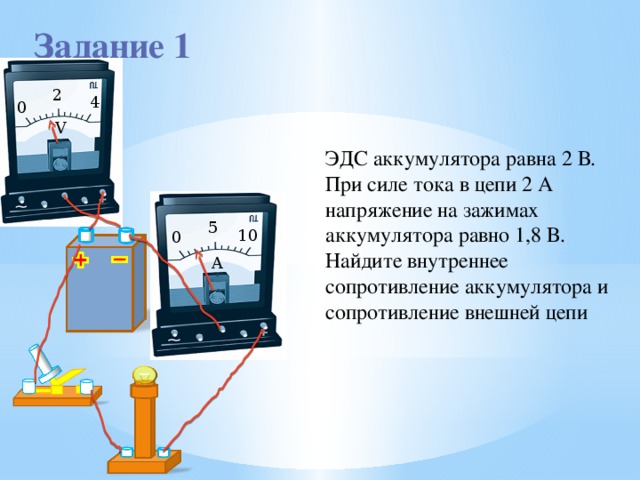 - Ввод заданных значений ЭДС, сопротивления нагрузки и внутреннего сопротивления в приведенное выше выражение дает \[I = \frac{\epsilon}{R + r} = \frac{12,00 \, V }{10,10 \, \Omega} = 1,188 \, A.\] Введите известные значения в уравнение \(V_{терминал} = \epsilon — Ir\), чтобы получить напряжение на клеммах: \[V_{терминал} = \ эпсилон — Ir = 12,00 \, V — (1,188 \, А)(0,100 \, \Омега) = 11,90 \, В. \] Напряжение на клеммах здесь лишь немного ниже, чем ЭДС, что означает, что ток, потребляемый этой легкой нагрузкой, незначителен.